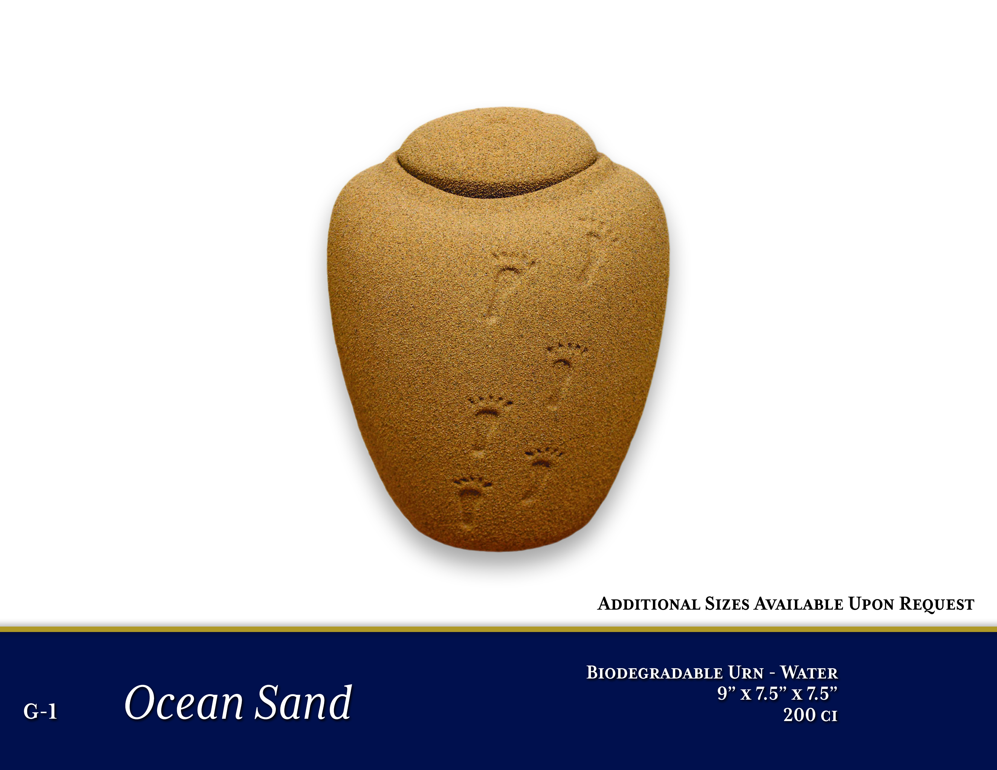 G-1 Ocean Sand Large Urn$360.00PriceBiodegradable UrnsAdditional sizes available upon request9" x 7.5" x 7.5"200 ciOpen Shareable Image