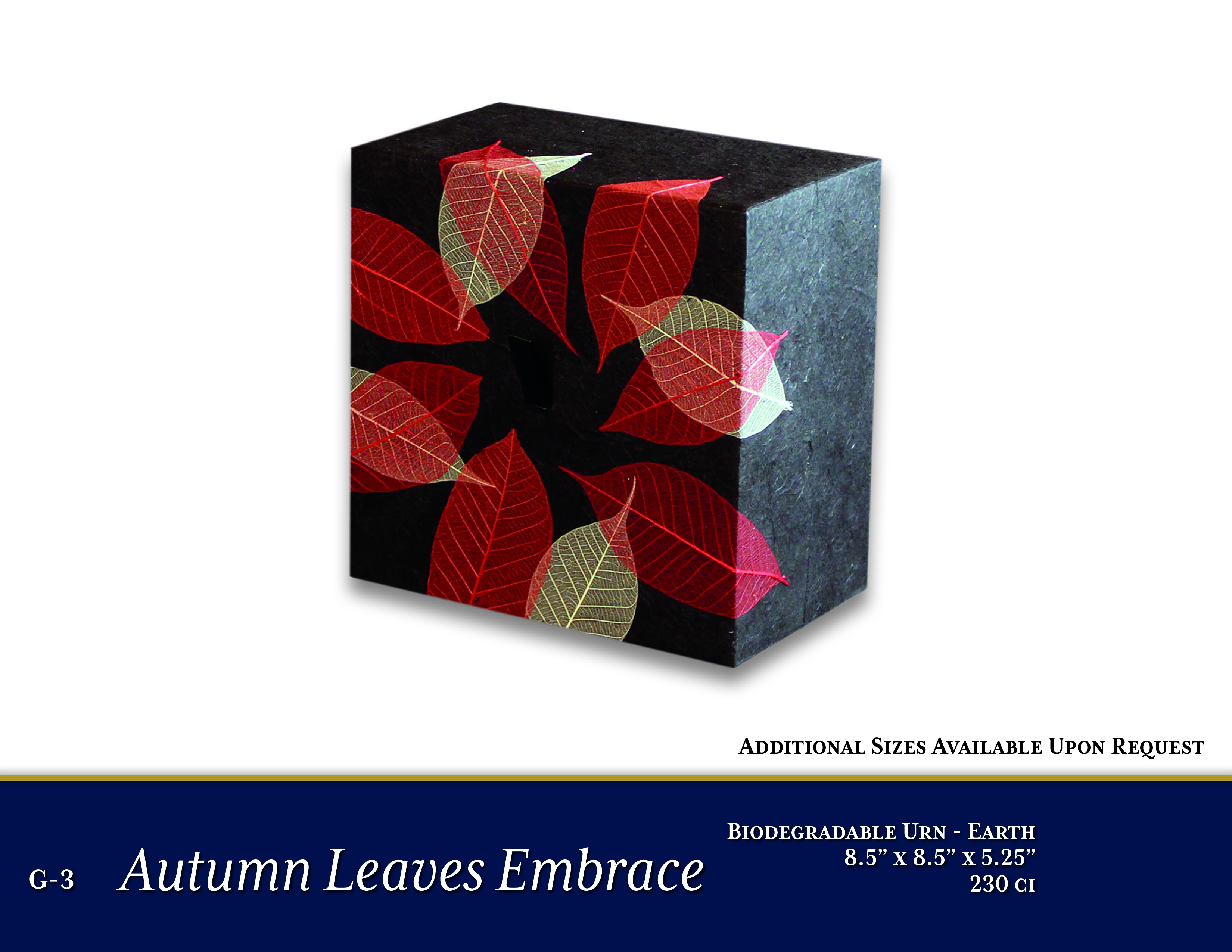 G-3 Autumn Leaves Embrace$160.00PriceBiodegradable UrnsAdditional sizes available upon request8.5" x 8.5" x 5.25"230 ciOpen Shareable Image