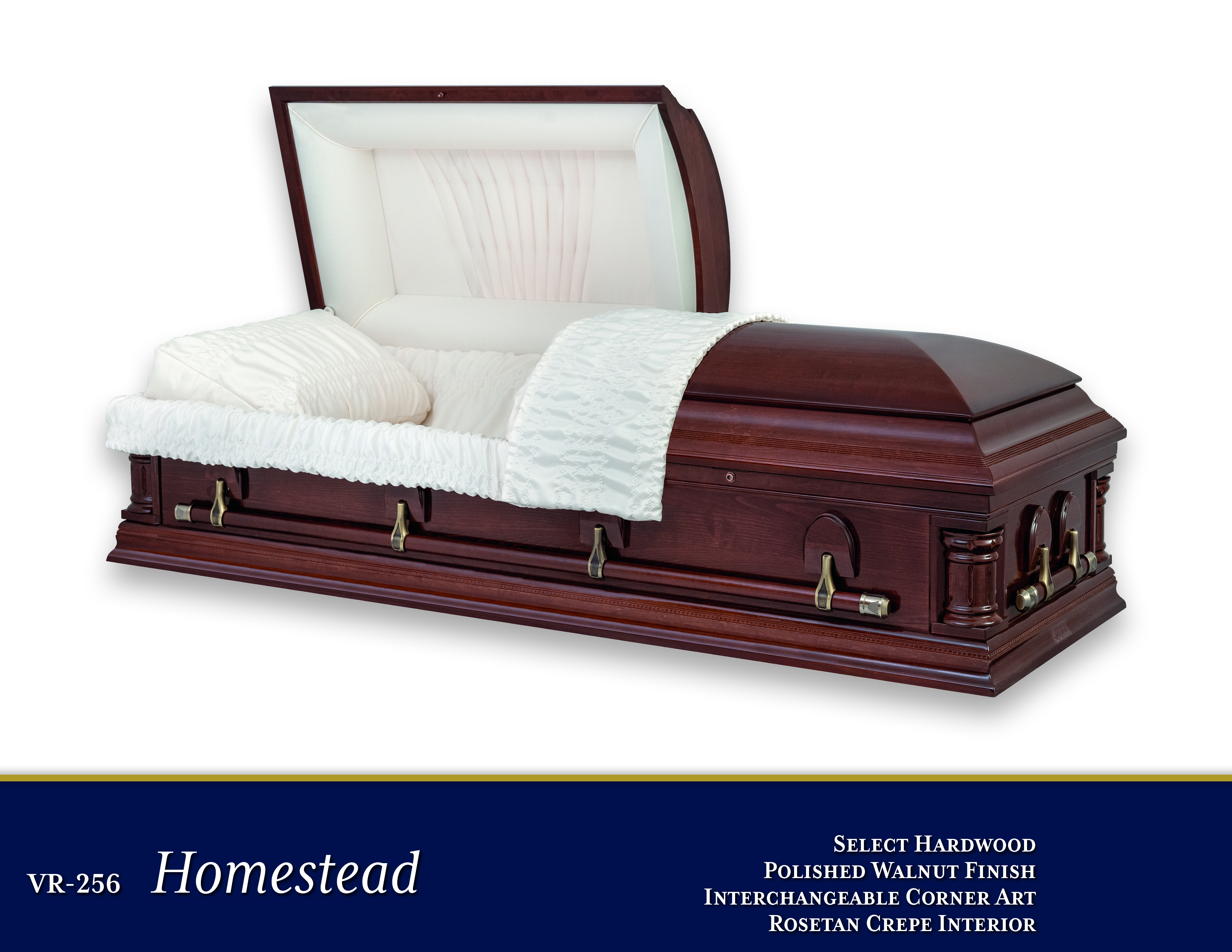 VR-256 Homestead$3,855.00PriceSelect HardwoodPolished Walnut FinishRosetan Crepe InteriorClick Here for Corner Art OptionsOpen Shareable Image